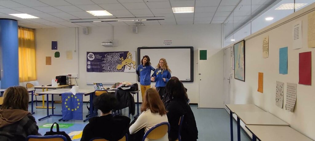 Nous avons à cœur de casser les codes d’une classe formelle et privilégier l’échange avec les jeunes et le débat entre ces derniers. Pour cela, nous nous appuyons sur des outils pédagogiques variés (carte géante, timeline européen, euroquiz, etc…) et surtout nous abordons avec les jeunes les sujets qui leur tiennent à cœur : histoire et géographie de l’Union, ses valeurs, ses symboles, ou encore le fonctionnement de ses institutions et la mobilité de ses citoyens.